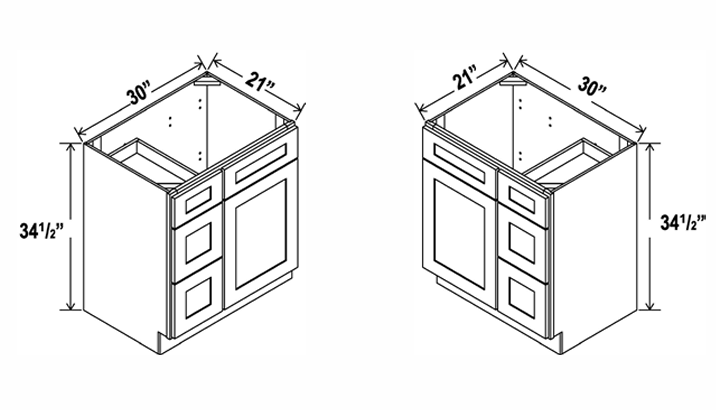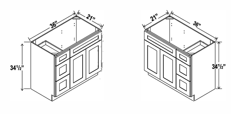 Charleston White Raised Panel vanity sink base cabinet 30" and 36" wide with 3 drawers.
